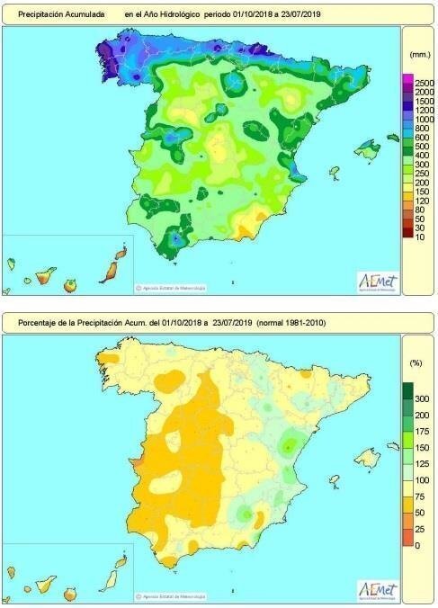 El valor medio de precipitaciones acumuladas desde que comenzó el año hidrológico el pasado 1 de octubre hasta el 23 de julio de 2019 ha alcanzado 483 litros por metro cuadrado, lo que representa un 16 por ciento por debajo del valor normal que corresponde a este periodo, que son 574 litros por metro cuadrado.