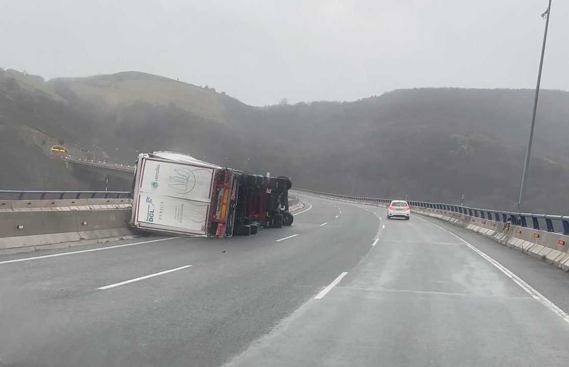 El fuerte viento provoca el vuelco de un camión en la autovía A-67