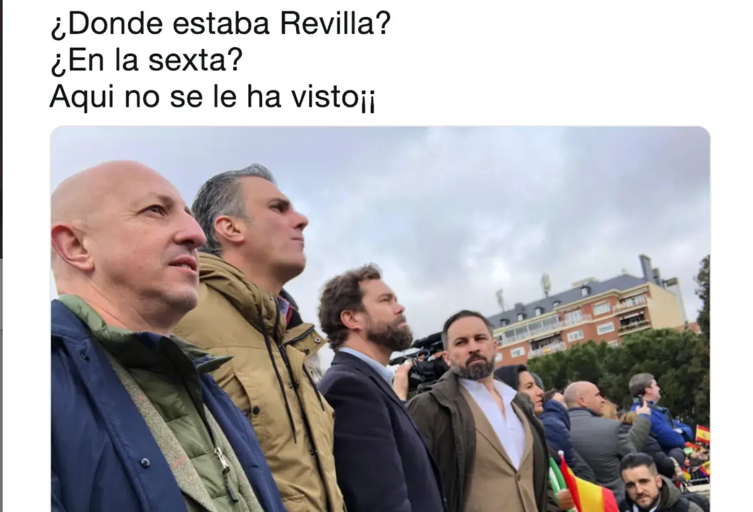 "En Madrid, defendiendo la unidad de la Nación, frente a los golpistas y el presidente traidor", en el tweet, Ricardo Garrudo, se pregunta si Revilla esta en LaSexta, dado que allí (en Colón) no se le ha visto.
