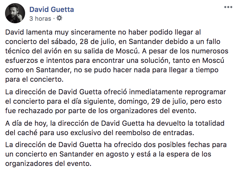 En el mismo, el equipo de Guetta indica también que ante la suspensión del concierto ofreció dos posibles fechas para celebrar uno nuevo en Santander en agosto, y está "a la espera" de respuesta de los organizadores del evento musical.