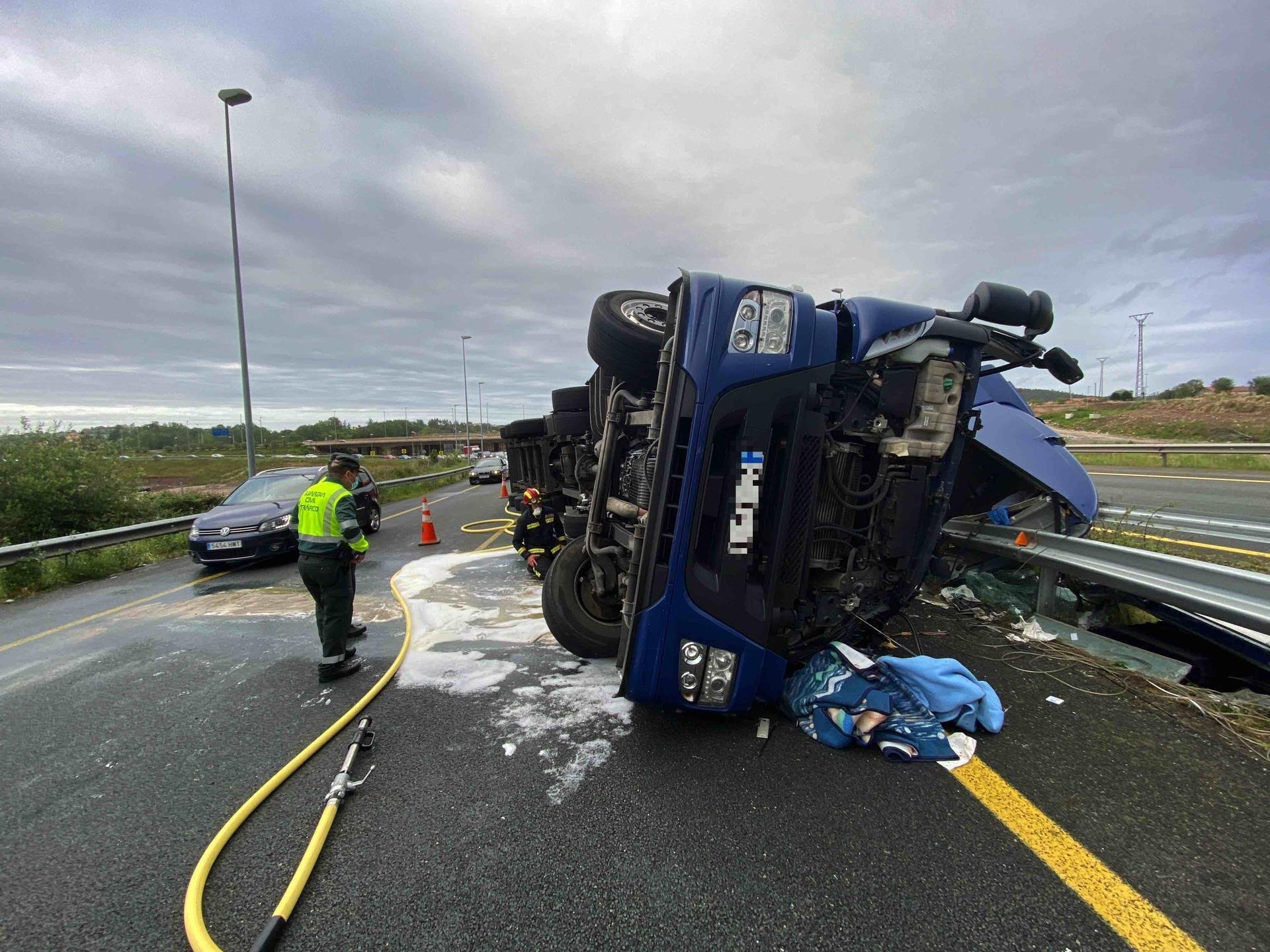 Un hombre de mediana edad ha resultado herido grave tras volcar el camión que conducía en la autovía A67 a su paso por la zona de Los Ochos, en Torrelavega, sentido Palencia.