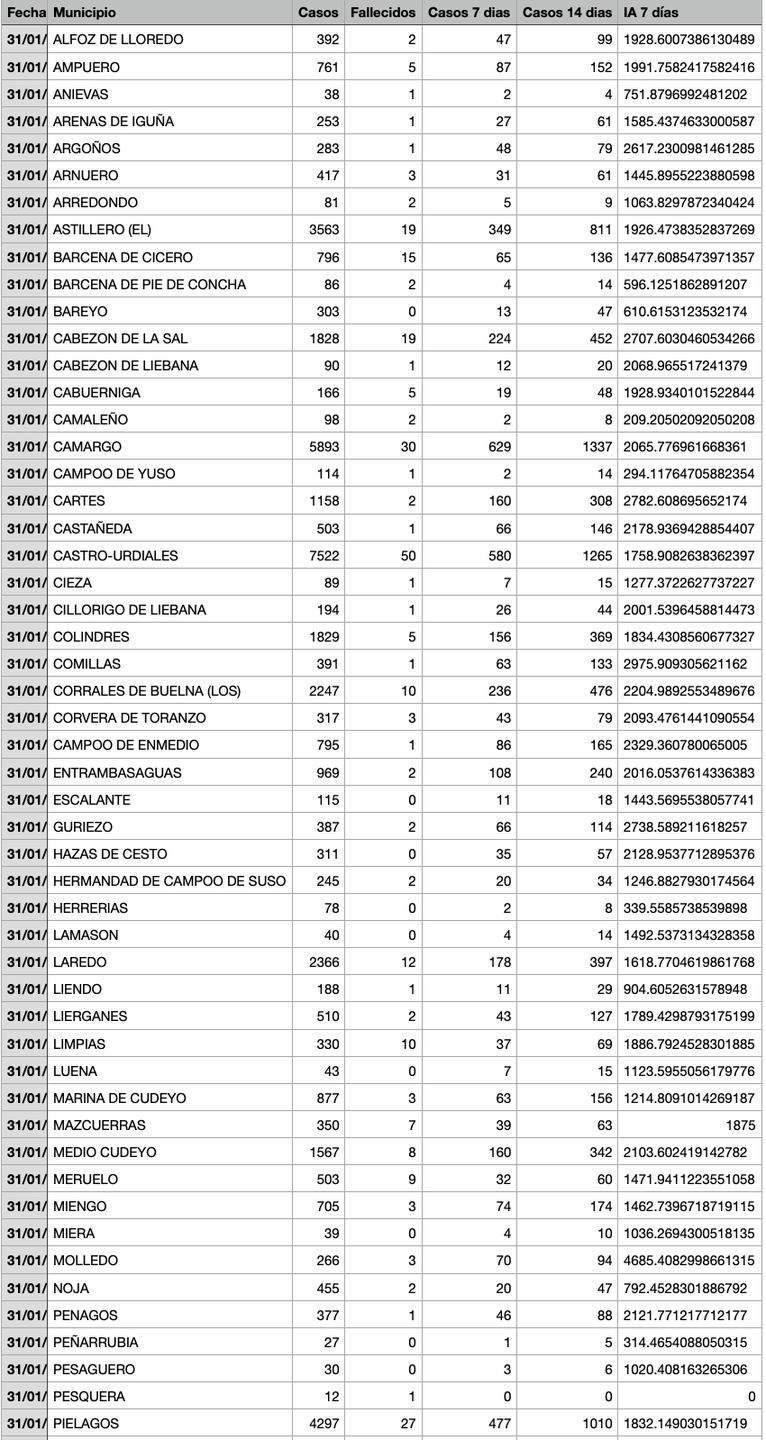 Para entender la tabla, Casos: Total desde el inicio de la pandemia. Fallecidos: Total desde el inicio de la pandemia. Casos 7: son casos nuevos en los últimos 7 días. Casos 14: Casos nuevos en los últimos 14 días. IA 7 días: Incidencia acumulada a 7 días sobre 100.000 habitantes.