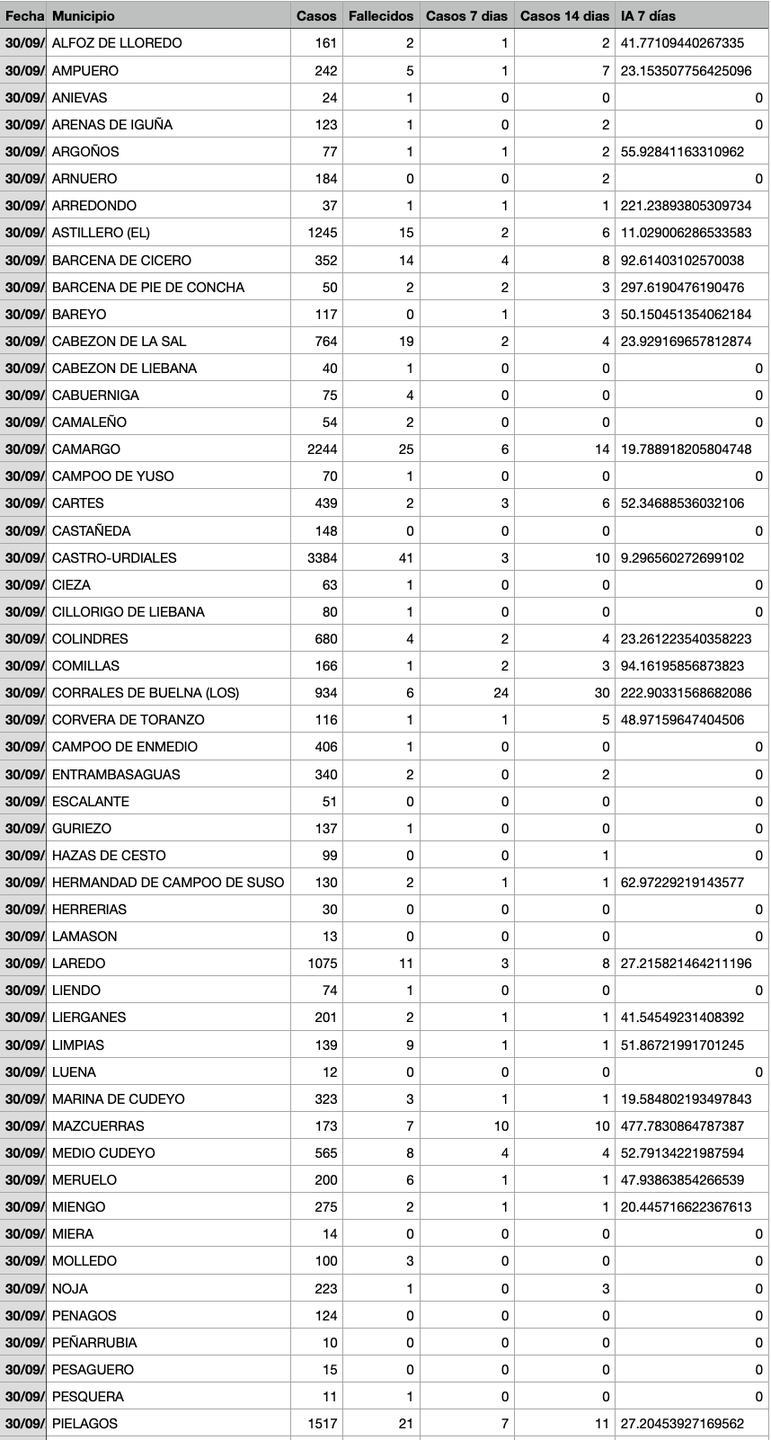 Para entender la tabla, Casos: Total desde el inicio de la pandemia. Fallecidos: Total desde el inicio de la pandemia. Casos 7: son casos nuevos en los últimos 7 días. Casos 14: Casos nuevos en los últimos 14 días. IA 7 días: Incidencia acumulada a 7 días sobre 100.000 habitantes.