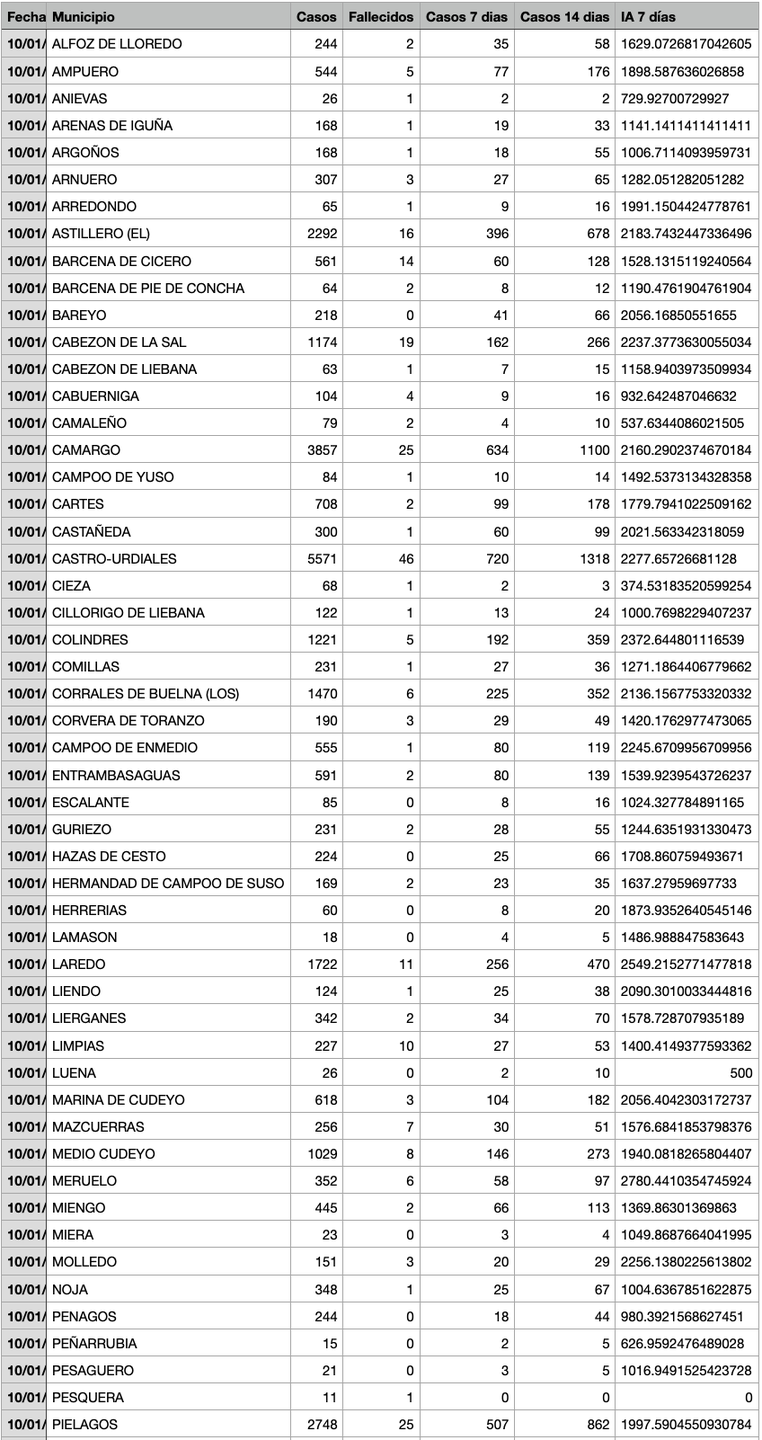 Para entender la tabla, Casos: Total desde el inicio de la pandemia. Fallecidos: Total desde el inicio de la pandemia. Casos 7: son casos nuevos en los últimos 7 días. Casos 14: Casos nuevos en los últimos 14 días. IA 7 días: Incidencia acumulada a 7 días sobre 100.000 habitantes.