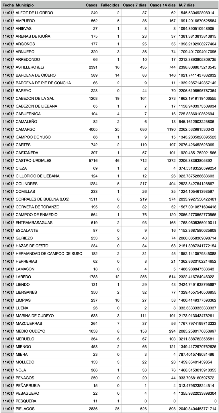 Para entender la tabla, Casos: Total desde el inicio de la pandemia. Fallecidos: Total desde el inicio de la pandemia. Casos 7: son casos nuevos en los últimos 7 días. Casos 14: Casos nuevos en los últimos 14 días. IA 7 días: Incidencia acumulada a 7 días sobre 100.000 habitantes.