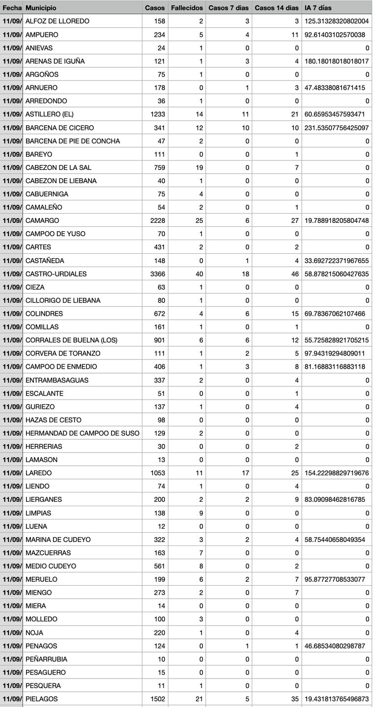 Para entender la tabla, Casos: Total desde el inicio de la pandemia. Fallecidos: Total desde el inicio de la pandemia. Casos 7: son casos nuevos en los últimos 7 días. Casos 14: Casos nuevos en los últimos 14 días. IA 7 días: Incidencia acumulada a 7 días sobre 100.000 habitantes.