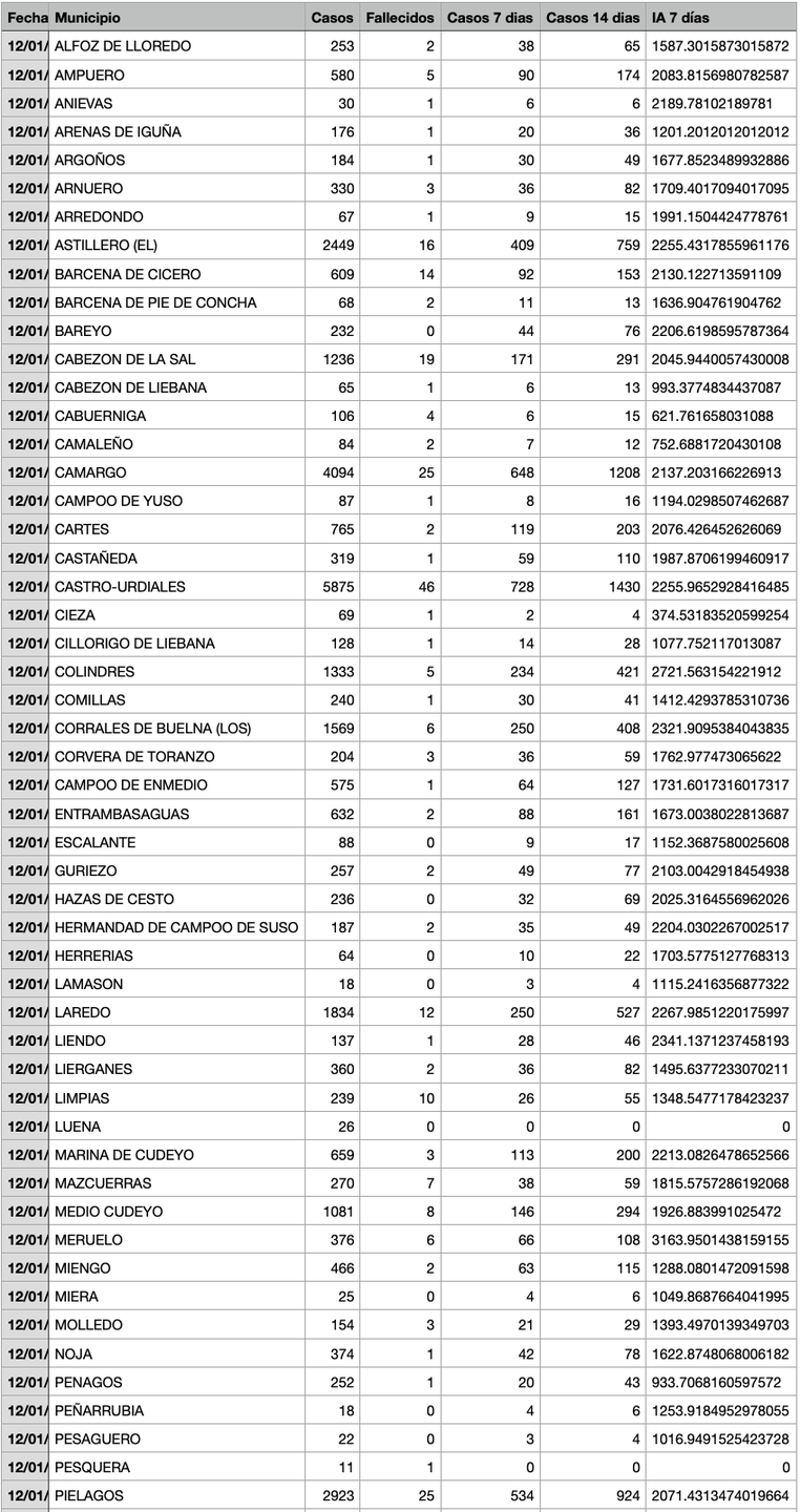 Para entender la tabla, Casos: Total desde el inicio de la pandemia. Fallecidos: Total desde el inicio de la pandemia. Casos 7: son casos nuevos en los últimos 7 días. Casos 14: Casos nuevos en los últimos 14 días. IA 7 días: Incidencia acumulada a 7 días sobre 100.000 habitantes.