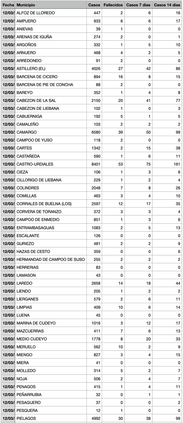Para entender la tabla, Casos: Total desde el inicio de la pandemia. Fallecidos: Total desde el inicio de la pandemia. Casos 7: son casos nuevos en los últimos 7 días. Casos 14: Casos nuevos en los últimos 14 días. IA 7 días: Incidencia acumulada a 7 días sobre 100.000 habitantes.