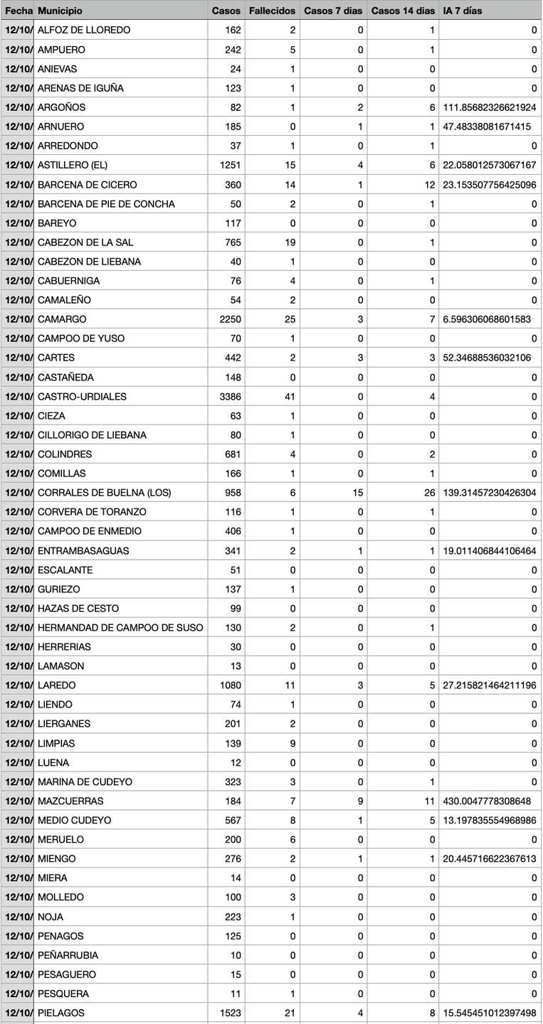Para entender la tabla, Casos: Total desde el inicio de la pandemia. Fallecidos: Total desde el inicio de la pandemia. Casos 7: son casos nuevos en los últimos 7 días. Casos 14: Casos nuevos en los últimos 14 días. IA 7 días: Incidencia acumulada a 7 días sobre 100.000 habitantes.