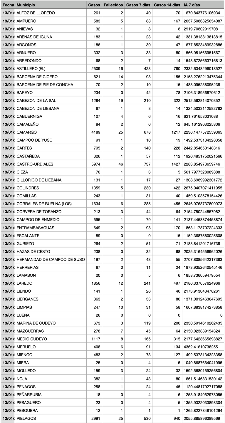 Para entender la tabla, Casos: Total desde el inicio de la pandemia. Fallecidos: Total desde el inicio de la pandemia. Casos 7: son casos nuevos en los últimos 7 días. Casos 14: Casos nuevos en los últimos 14 días. IA 7 días: Incidencia acumulada a 7 días sobre 100.000 habitantes.
