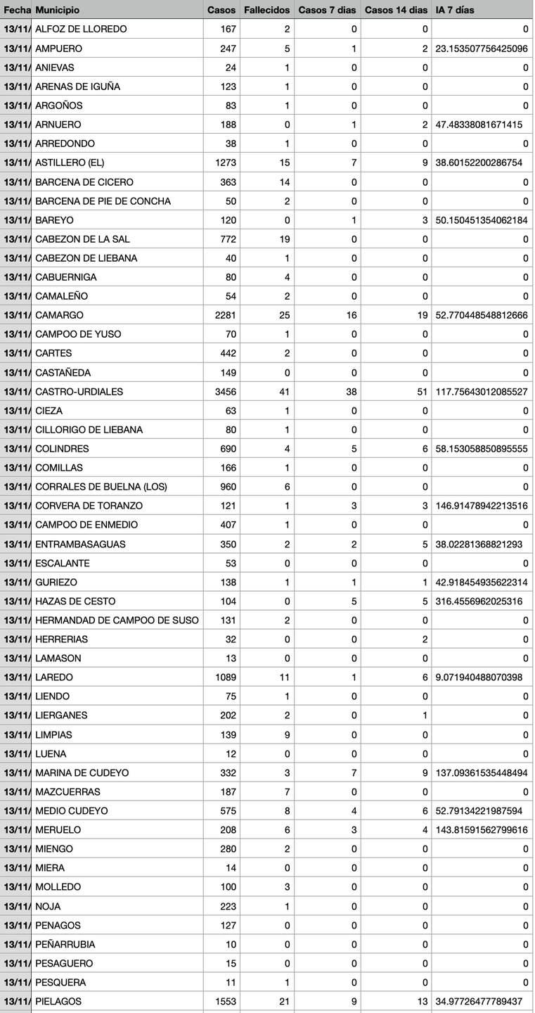 Para entender la tabla, Casos: Total desde el inicio de la pandemia. Fallecidos: Total desde el inicio de la pandemia. Casos 7: son casos nuevos en los últimos 7 días. Casos 14: Casos nuevos en los últimos 14 días. IA 7 días: Incidencia acumulada a 7 días sobre 100.000 habitantes.