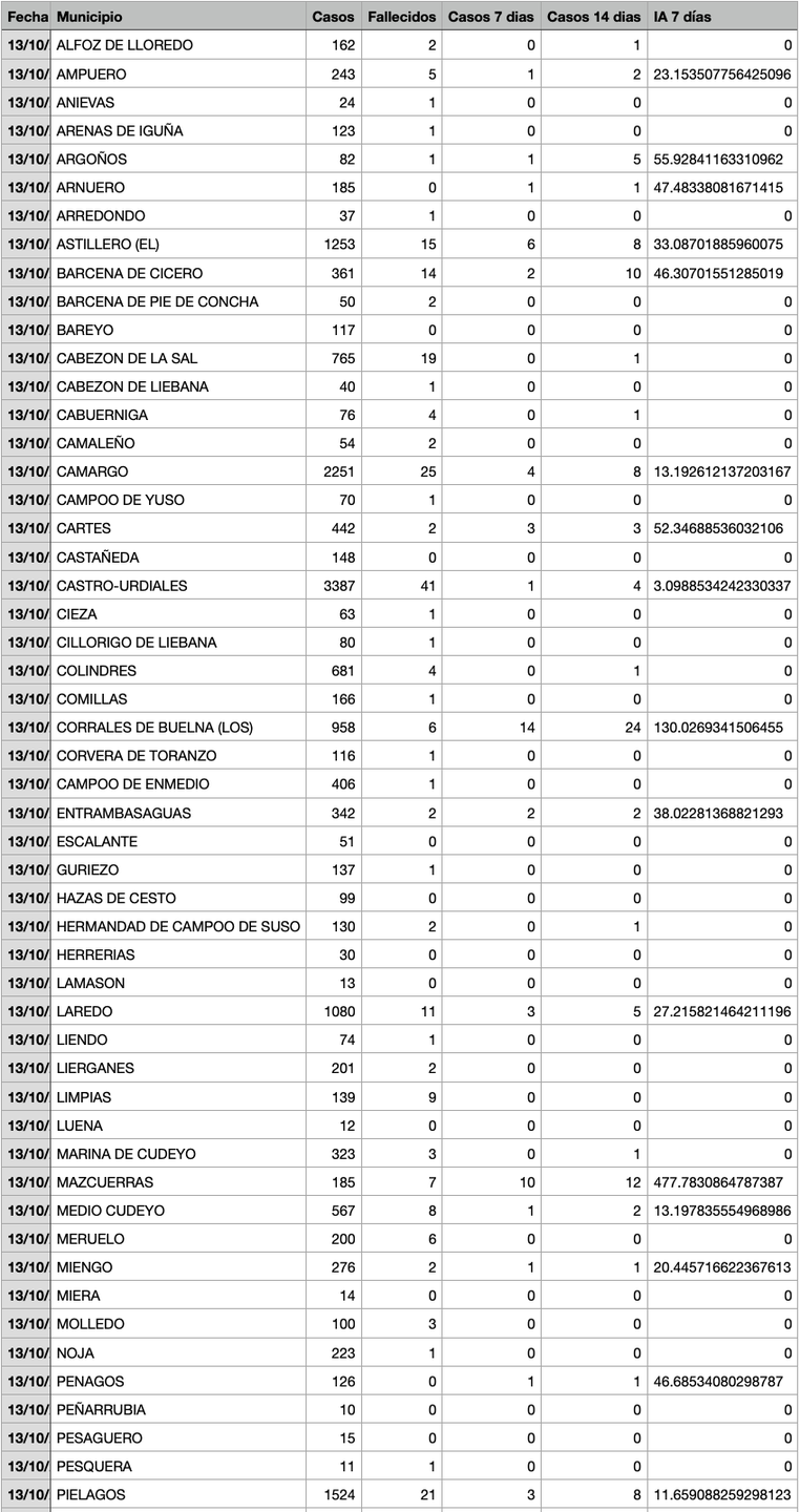 Para entender la tabla, Casos: Total desde el inicio de la pandemia. Fallecidos: Total desde el inicio de la pandemia. Casos 7: son casos nuevos en los últimos 7 días. Casos 14: Casos nuevos en los últimos 14 días. IA 7 días: Incidencia acumulada a 7 días sobre 100.000 habitantes.