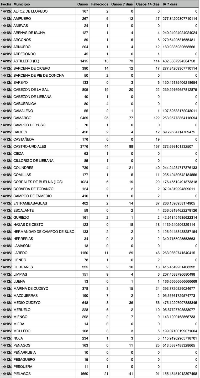 Para entender la tabla, Casos: Total desde el inicio de la pandemia. Fallecidos: Total desde el inicio de la pandemia. Casos 7: son casos nuevos en los últimos 7 días. Casos 14: Casos nuevos en los últimos 14 días. IA 7 días: Incidencia acumulada a 7 días sobre 100.000 habitantes.