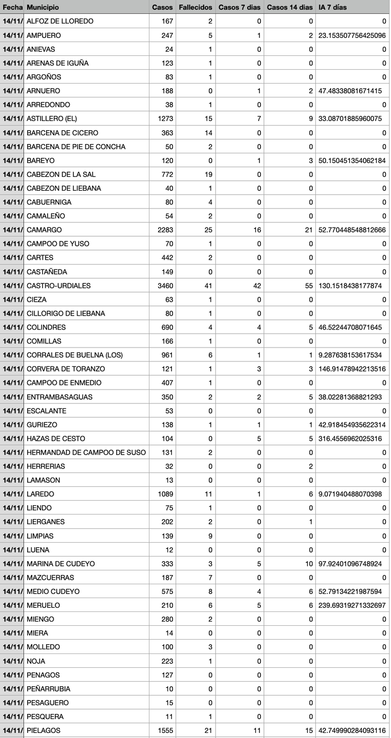 Para entender la tabla, Casos: Total desde el inicio de la pandemia. Fallecidos: Total desde el inicio de la pandemia. Casos 7: son casos nuevos en los últimos 7 días. Casos 14: Casos nuevos en los últimos 14 días. IA 7 días: Incidencia acumulada a 7 días sobre 100.000 habitantes.