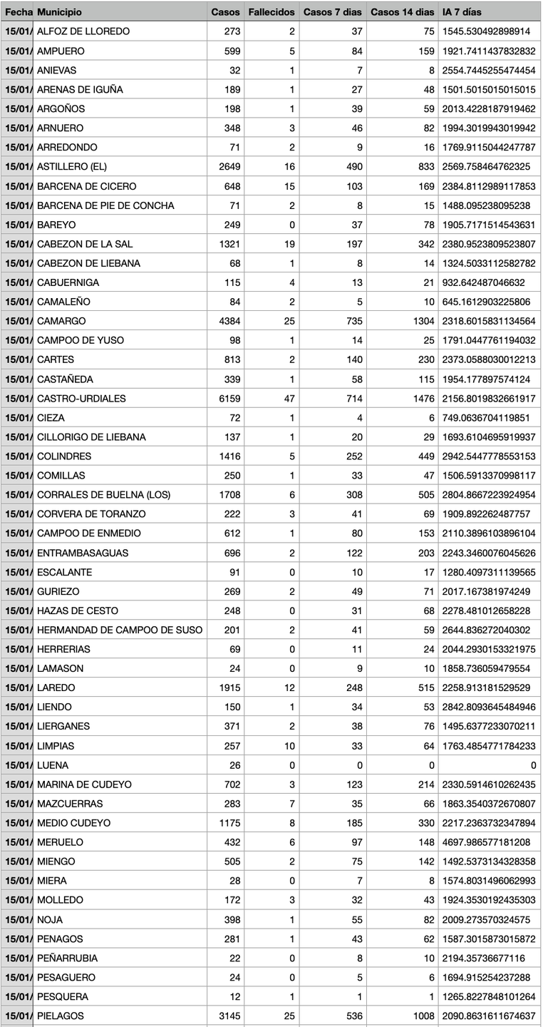 Para entender la tabla, Casos: Total desde el inicio de la pandemia. Fallecidos: Total desde el inicio de la pandemia. Casos 7: son casos nuevos en los últimos 7 días. Casos 14: Casos nuevos en los últimos 14 días. IA 7 días: Incidencia acumulada a 7 días sobre 100.000 habitantes.