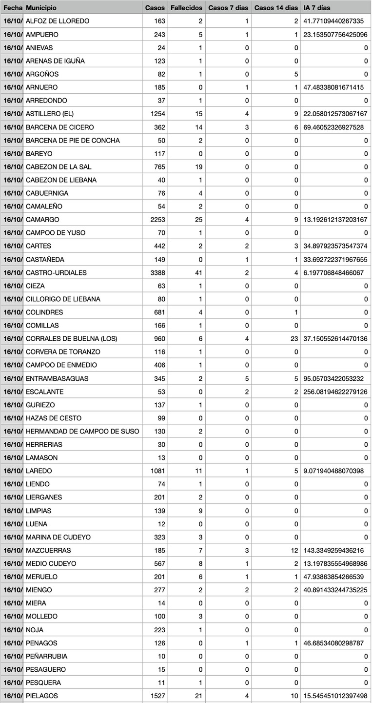 Para entender la tabla, Casos: Total desde el inicio de la pandemia. Fallecidos: Total desde el inicio de la pandemia. Casos 7: son casos nuevos en los últimos 7 días. Casos 14: Casos nuevos en los últimos 14 días. IA 7 días: Incidencia acumulada a 7 días sobre 100.000 habitantes.
