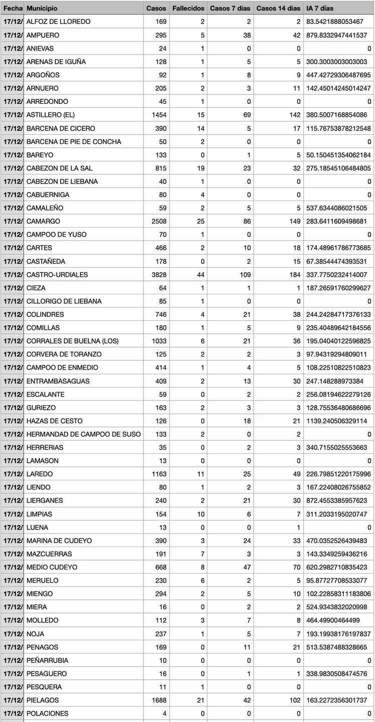 Para entender la tabla, Casos: Total desde el inicio de la pandemia. Fallecidos: Total desde el inicio de la pandemia. Casos 7: son casos nuevos en los últimos 7 días. Casos 14: Casos nuevos en los últimos 14 días. IA 7 días: Incidencia acumulada a 7 días sobre 100.000 habitantes.