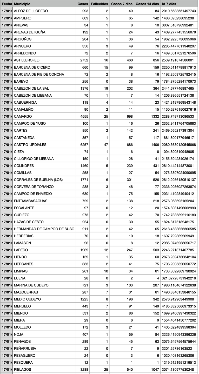 Para entender la tabla, Casos: Total desde el inicio de la pandemia. Fallecidos: Total desde el inicio de la pandemia. Casos 7: son casos nuevos en los últimos 7 días. Casos 14: Casos nuevos en los últimos 14 días. IA 7 días: Incidencia acumulada a 7 días sobre 100.000 habitantes.
