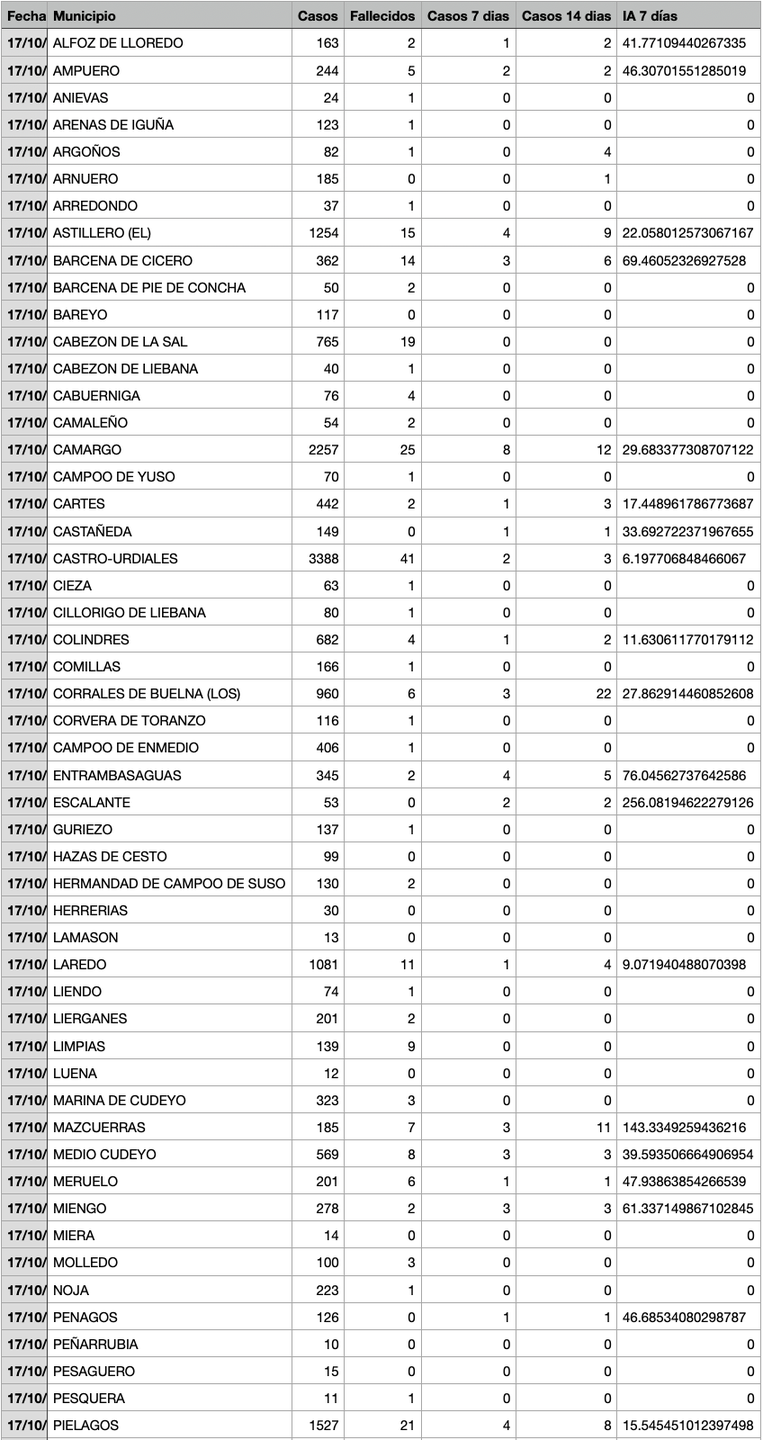 Para entender la tabla, Casos: Total desde el inicio de la pandemia. Fallecidos: Total desde el inicio de la pandemia. Casos 7: son casos nuevos en los últimos 7 días. Casos 14: Casos nuevos en los últimos 14 días. IA 7 días: Incidencia acumulada a 7 días sobre 100.000 habitantes.
