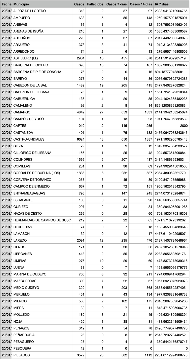 Para entender la tabla, Casos: Total desde el inicio de la pandemia. Fallecidos: Total desde el inicio de la pandemia. Casos 7: son casos nuevos en los últimos 7 días. Casos 14: Casos nuevos en los últimos 14 días. IA 7 días: Incidencia acumulada a 7 días sobre 100.000 habitantes.