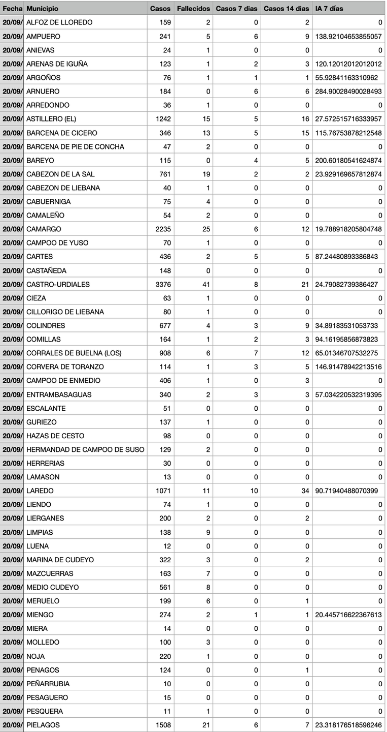 Para entender la tabla, Casos: Total desde el inicio de la pandemia. Fallecidos: Total desde el inicio de la pandemia. Casos 7: son casos nuevos en los últimos 7 días. Casos 14: Casos nuevos en los últimos 14 días. IA 7 días: Incidencia acumulada a 7 días sobre 100.000 habitantes.