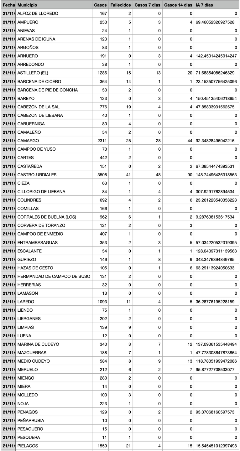 Para entender la tabla, Casos: Total desde el inicio de la pandemia. Fallecidos: Total desde el inicio de la pandemia. Casos 7: son casos nuevos en los últimos 7 días. Casos 14: Casos nuevos en los últimos 14 días. IA 7 días: Incidencia acumulada a 7 días sobre 100.000 habitantes.