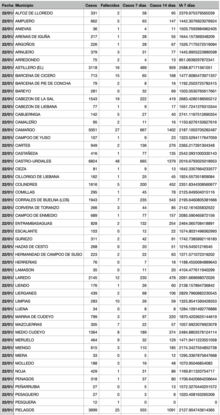 Para entender la tabla, Casos: Total desde el inicio de la pandemia. Fallecidos: Total desde el inicio de la pandemia. Casos 7: son casos nuevos en los últimos 7 días. Casos 14: Casos nuevos en los últimos 14 días. IA 7 días: Incidencia acumulada a 7 días sobre 100.000 habitantes.