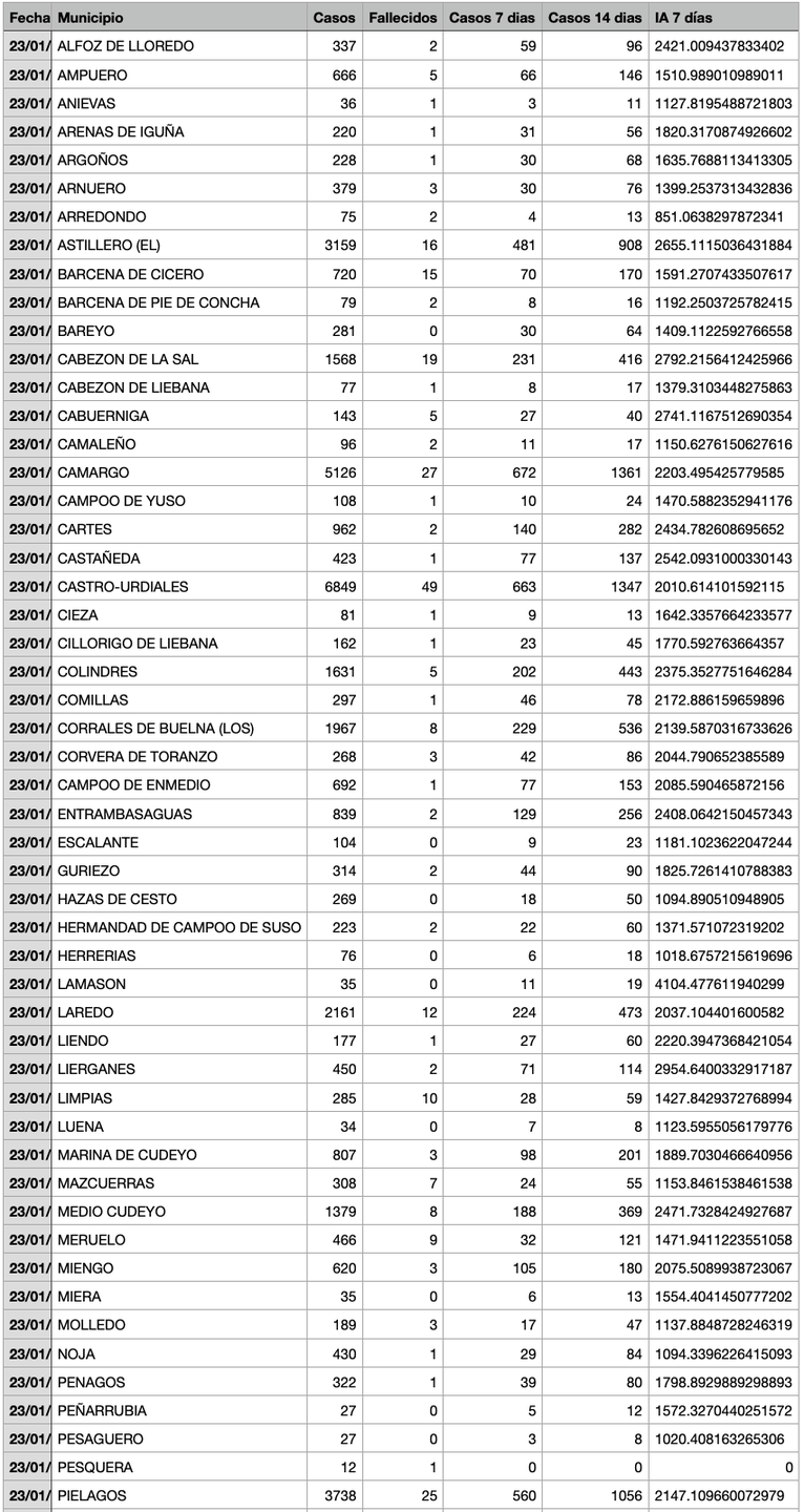 Para entender la tabla, Casos: Total desde el inicio de la pandemia. Fallecidos: Total desde el inicio de la pandemia. Casos 7: son casos nuevos en los últimos 7 días. Casos 14: Casos nuevos en los últimos 14 días. IA 7 días: Incidencia acumulada a 7 días sobre 100.000 habitantes.