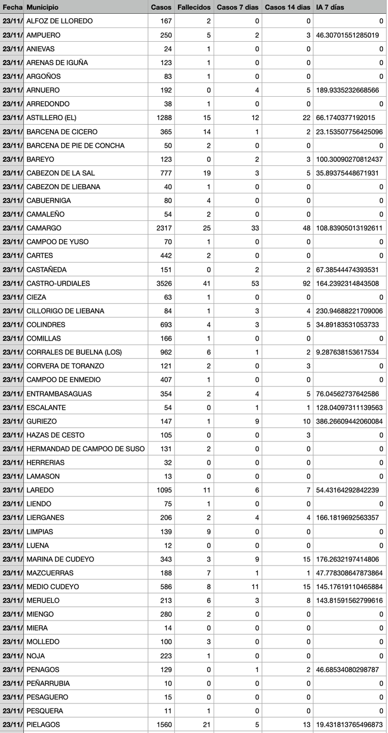 Para entender la tabla, Casos: Total desde el inicio de la pandemia. Fallecidos: Total desde el inicio de la pandemia. Casos 7: son casos nuevos en los últimos 7 días. Casos 14: Casos nuevos en los últimos 14 días. IA 7 días: Incidencia acumulada a 7 días sobre 100.000 habitantes.