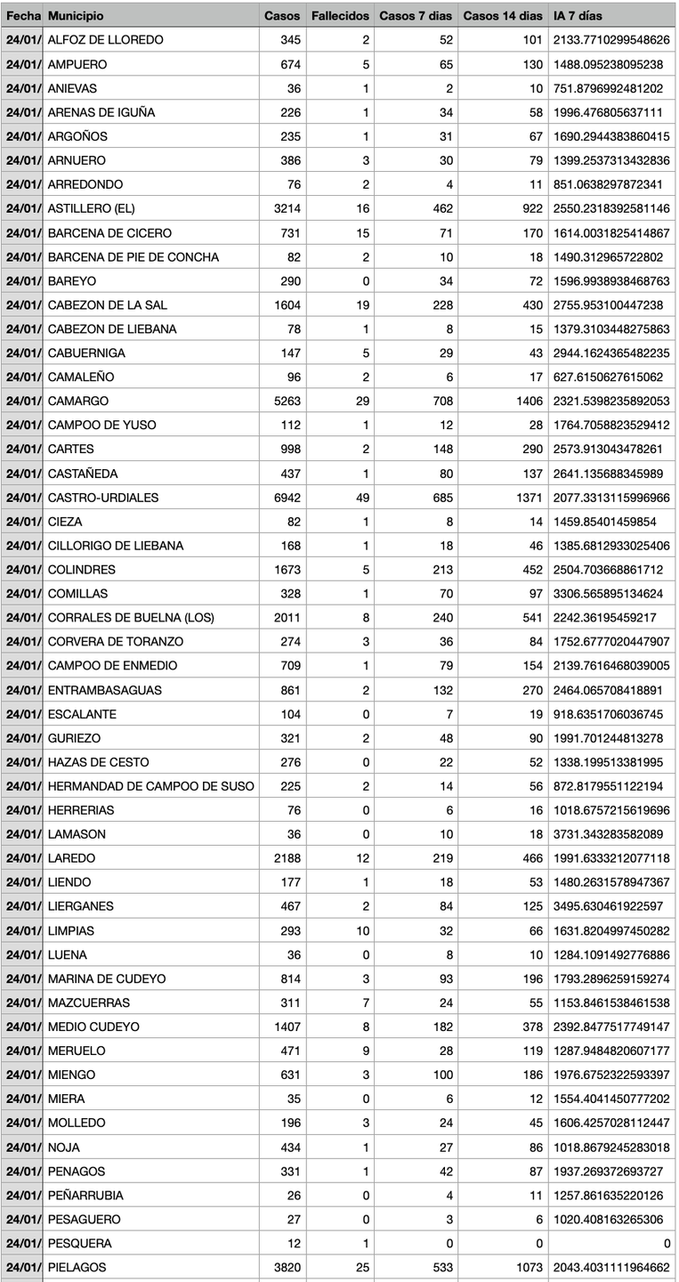 Para entender la tabla, Casos: Total desde el inicio de la pandemia. Fallecidos: Total desde el inicio de la pandemia. Casos 7: son casos nuevos en los últimos 7 días. Casos 14: Casos nuevos en los últimos 14 días. IA 7 días: Incidencia acumulada a 7 días sobre 100.000 habitantes.