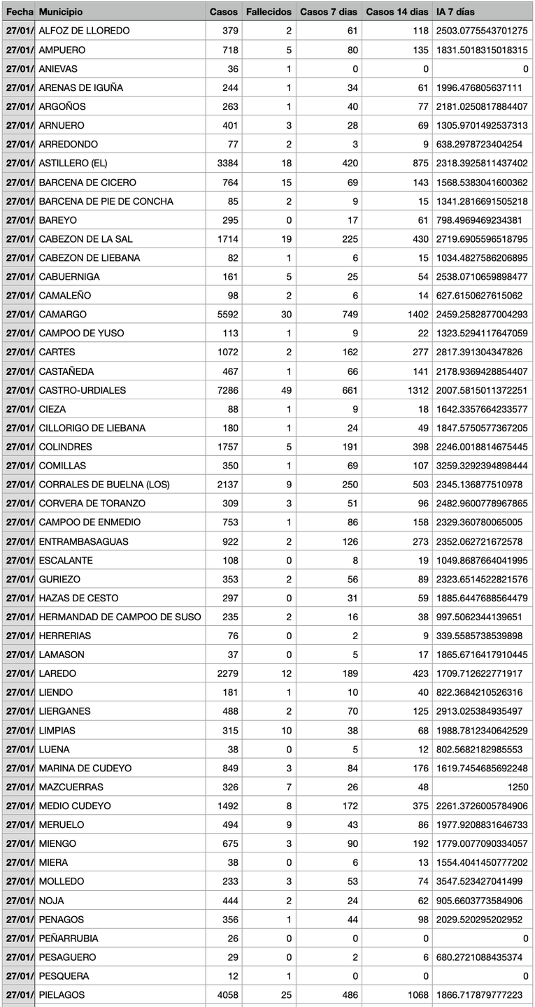 Para entender la tabla, Casos: Total desde el inicio de la pandemia. Fallecidos: Total desde el inicio de la pandemia. Casos 7: son casos nuevos en los últimos 7 días. Casos 14: Casos nuevos en los últimos 14 días. IA 7 días: Incidencia acumulada a 7 días sobre 100.000 habitantes.