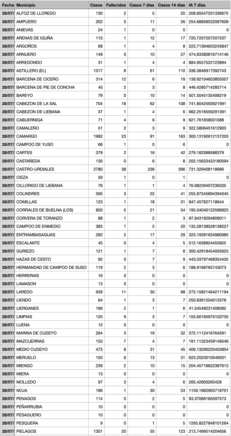 Para entender la tabla, Casos: Total desde el inicio de la pandemia. Fallecidos: Total desde el inicio de la pandemia. Casos 7: son casos nuevos en los últimos 7 días. Casos 14: Casos nuevos en los últimos 14 días. IA 7 días: Incidencia acumulada a 7 días sobre 100.000 habitantes.