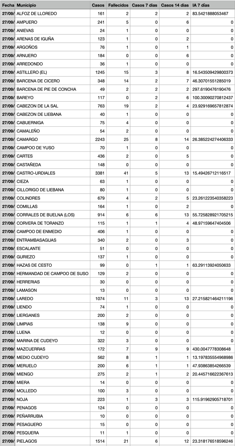 Para entender la tabla, Casos: Total desde el inicio de la pandemia. Fallecidos: Total desde el inicio de la pandemia. Casos 7: son casos nuevos en los últimos 7 días. Casos 14: Casos nuevos en los últimos 14 días. IA 7 días: Incidencia acumulada a 7 días sobre 100.000 habitantes.