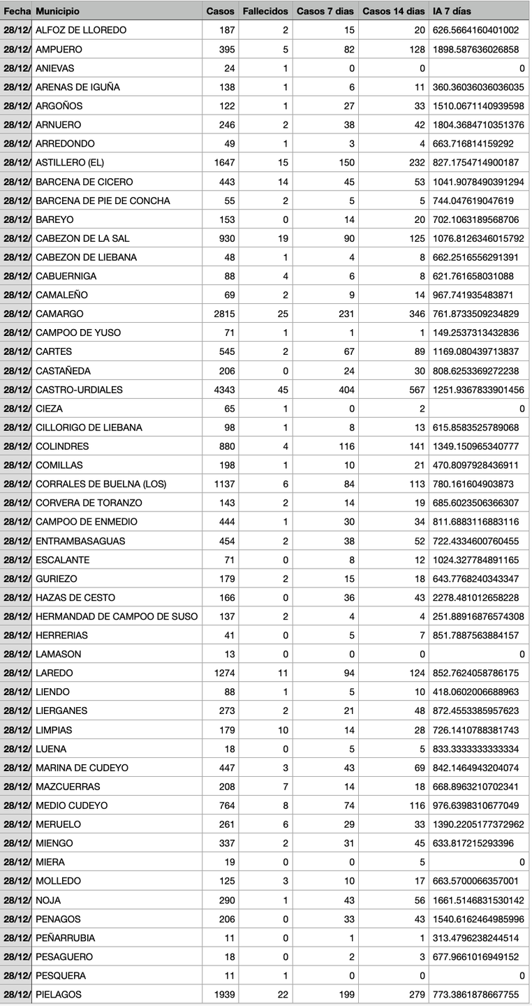 Para entender la tabla, Casos: Total desde el inicio de la pandemia. Fallecidos: Total desde el inicio de la pandemia. Casos 7: son casos nuevos en los últimos 7 días. Casos 14: Casos nuevos en los últimos 14 días. IA 7 días: Incidencia acumulada a 7 días sobre 100.000 habitantes.