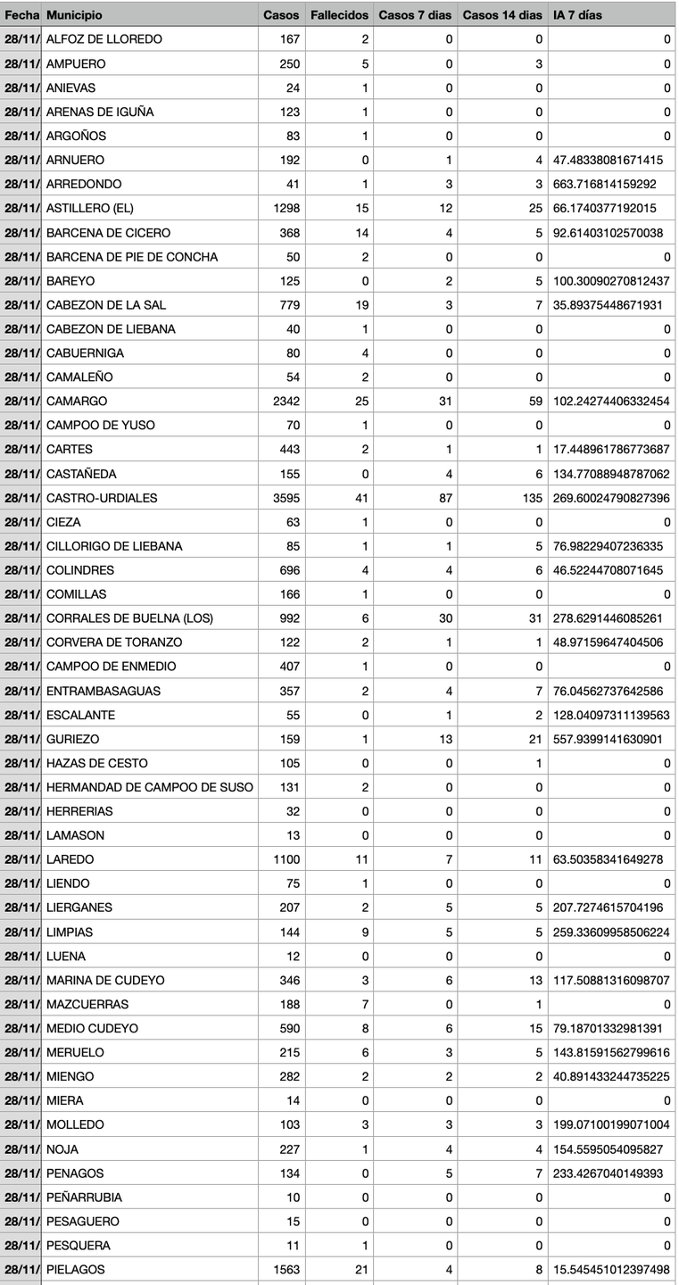 Para entender la tabla, Casos: Total desde el inicio de la pandemia. Fallecidos: Total desde el inicio de la pandemia. Casos 7: son casos nuevos en los últimos 7 días. Casos 14: Casos nuevos en los últimos 14 días. IA 7 días: Incidencia acumulada a 7 días sobre 100.000 habitantes.