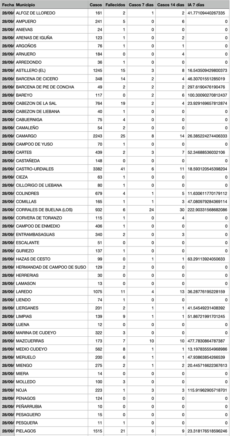 Para entender la tabla, Casos: Total desde el inicio de la pandemia. Fallecidos: Total desde el inicio de la pandemia. Casos 7: son casos nuevos en los últimos 7 días. Casos 14: Casos nuevos en los últimos 14 días. IA 7 días: Incidencia acumulada a 7 días sobre 100.000 habitantes.
