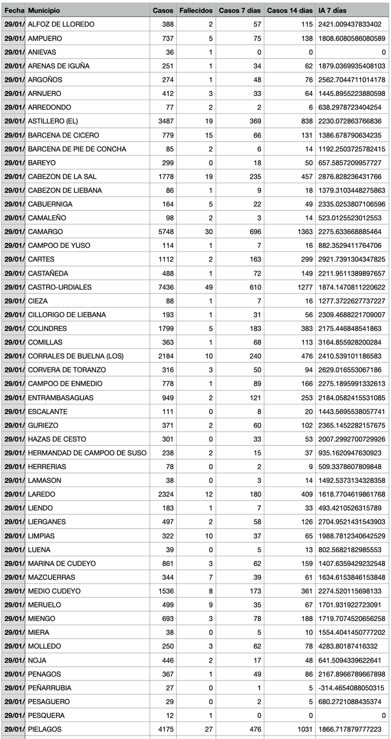 Para entender la tabla, Casos: Total desde el inicio de la pandemia. Fallecidos: Total desde el inicio de la pandemia. Casos 7: son casos nuevos en los últimos 7 días. Casos 14: Casos nuevos en los últimos 14 días. IA 7 días: Incidencia acumulada a 7 días sobre 100.000 habitantes.