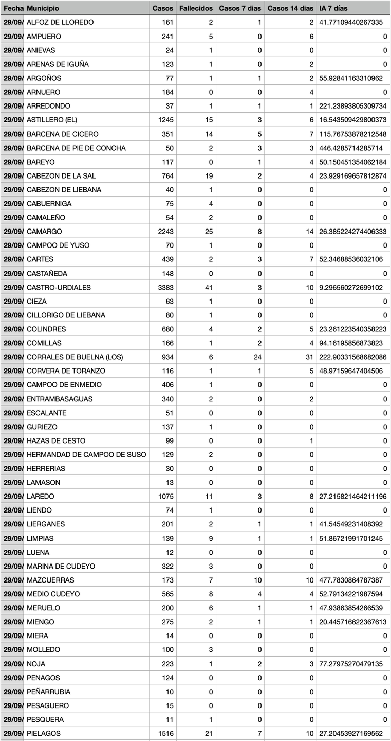 Para entender la tabla, Casos: Total desde el inicio de la pandemia. Fallecidos: Total desde el inicio de la pandemia. Casos 7: son casos nuevos en los últimos 7 días. Casos 14: Casos nuevos en los últimos 14 días. IA 7 días: Incidencia acumulada a 7 días sobre 100.000 habitantes.