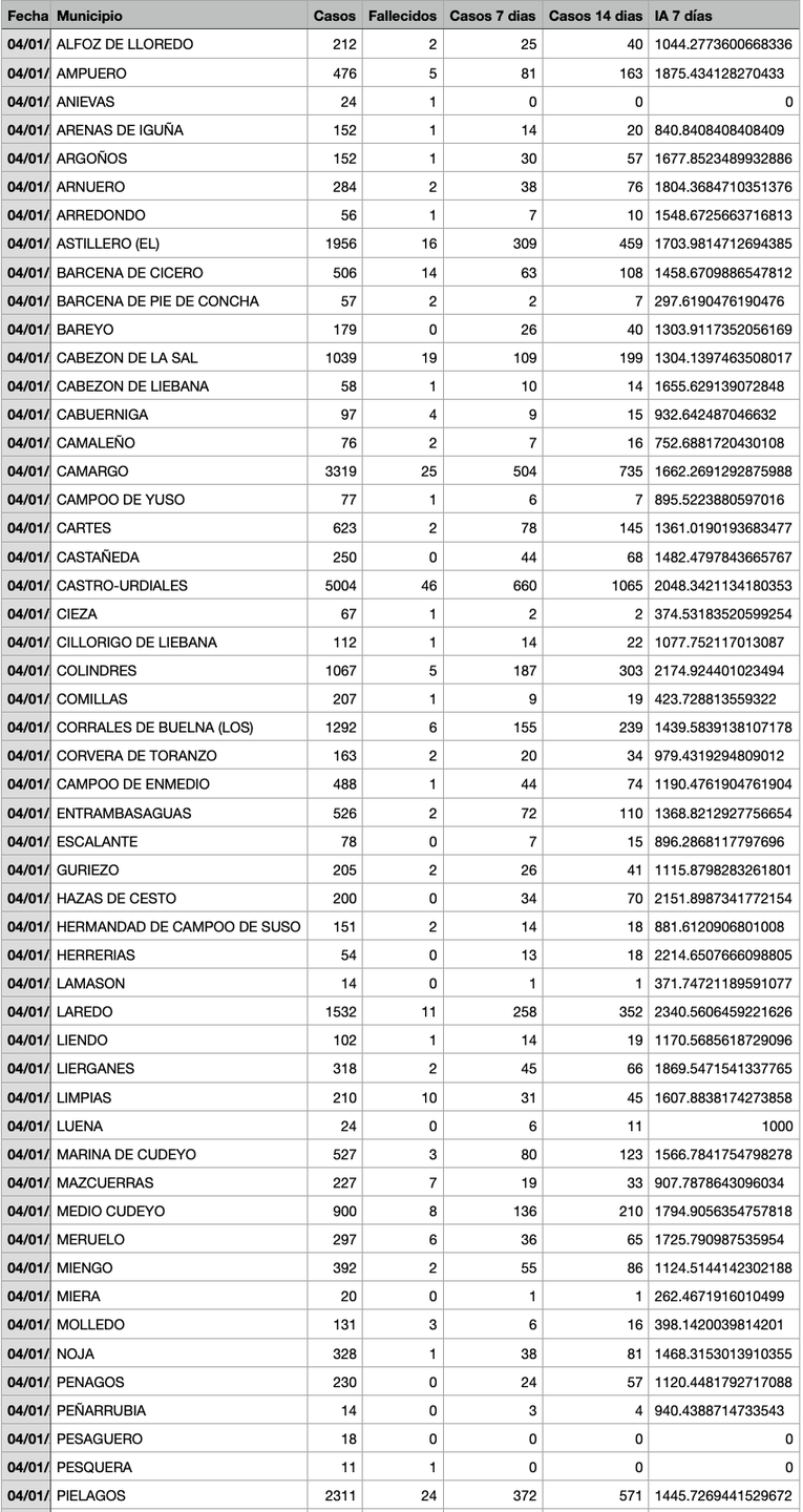 Para entender la tabla, Casos: Total desde el inicio de la pandemia. Fallecidos: Total desde el inicio de la pandemia. Casos 7: son casos nuevos en los últimos 7 días. Casos 14: Casos nuevos en los últimos 14 días. IA 7 días: Incidencia acumulada a 7 días sobre 100.000 habitantes.