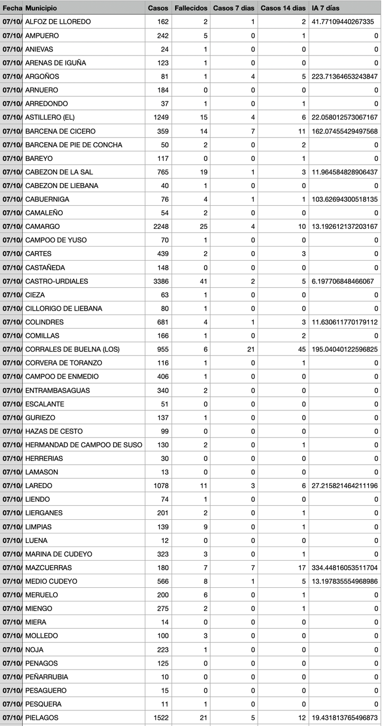 Para entender la tabla, Casos: Total desde el inicio de la pandemia. Fallecidos: Total desde el inicio de la pandemia. Casos 7: son casos nuevos en los últimos 7 días. Casos 14: Casos nuevos en los últimos 14 días. IA 7 días: Incidencia acumulada a 7 días sobre 100.000 habitantes.