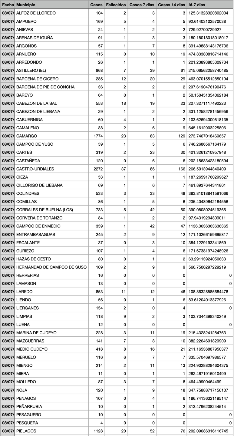Para entender la tabla, Casos: Total desde el inicio de la pandemia. Fallecidos: Total desde el inicio de la pandemia. Casos 7: son casos nuevos en los últimos 7 días. Casos 14: Casos nuevos en los últimos 14 días. IA 7 días: Incidencia acumulada a 7 días sobre 100.000 habitantes.