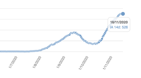 La región registra este martes (con los datos conocidos hoy correspondientes a ayer) la tasa más alta de incidencia por cada 100.000 habitantes a 14 días desde que comenzó en septiembre la segunda ola de coronavirus tal como se aprecia en la tabla superior.