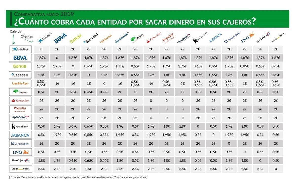 Le siguen Caixabank, Banco Santander, Banco Popular, Openbank y Deutsche Bank, cinco entidades cobran 2 euros a cualquier cliente que no sea de su entidad y que saque dinero en alguno de sus cajeros. En el caso de Openbank cabe destacar que solo tiene un cajero en toda España, aunque sus clientes pueden usar los de Banco Santander y Banco Popular sin pagar comisiones.