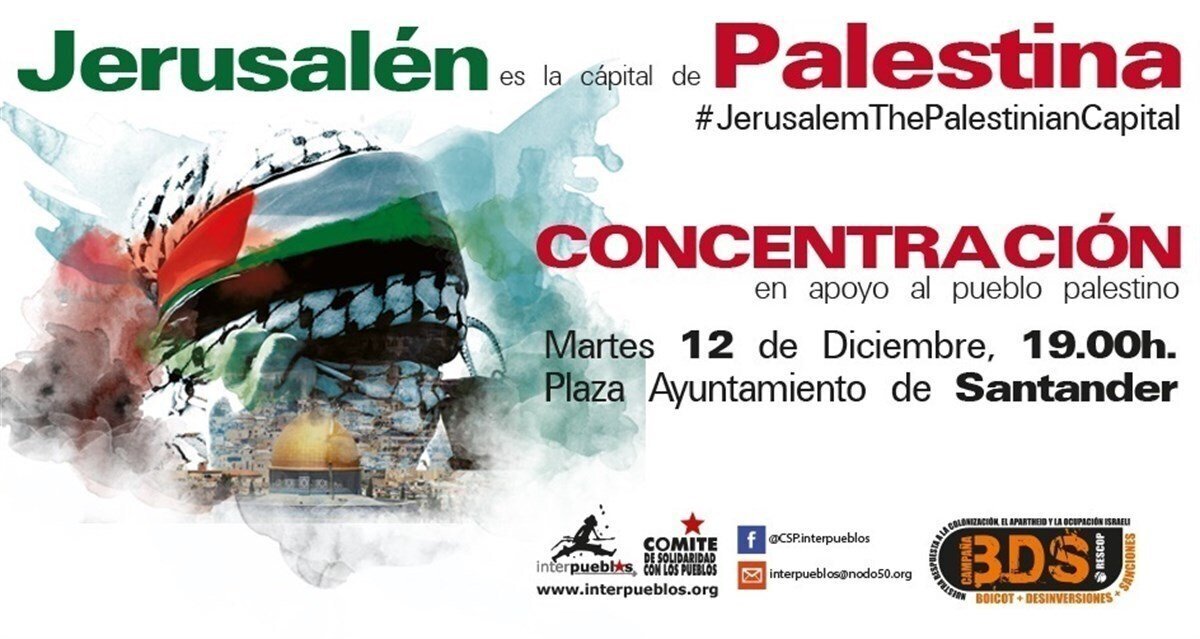 La Asociación Interpueblos y el Comité de Solidaridad con los Pueblos han convocado para este martes, 12 de diciembre, a las 19.00 horas, en la plaza del Ayuntamiento de Santander, una concentración de apoyo al pueblo palestino.