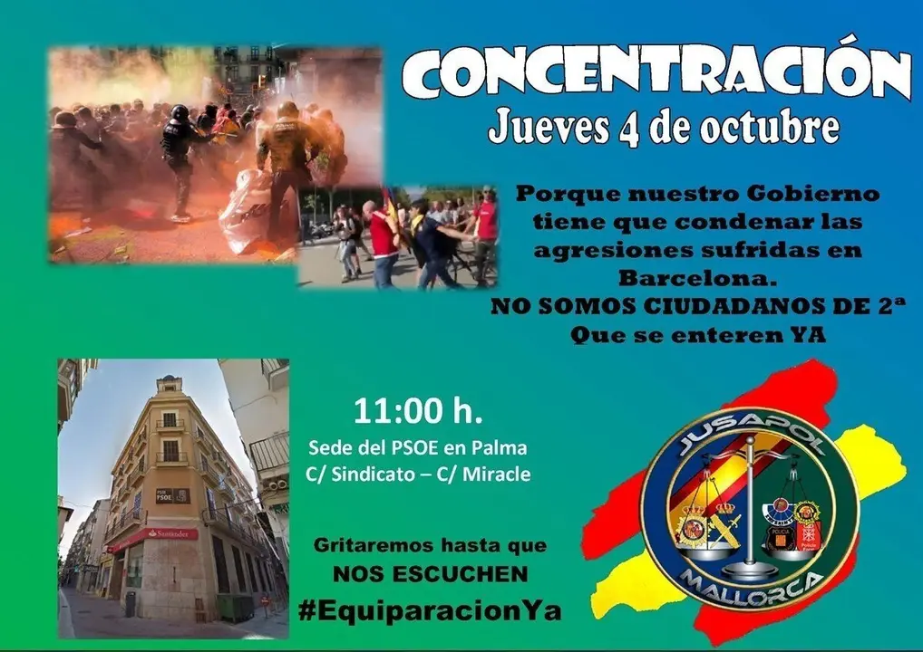 Se trata el de este jueves de un acto convocado en las sedes del PSOE --el partido del Gobierno de España-- de todo el territorio nacional para condenar la agresión que sufrieron algunos de los participantes en una manifestación de Jusapol celebrada el 29S para homenajear a los agentes que trataron de impedir el referéndum del 1-O en Cataluña.