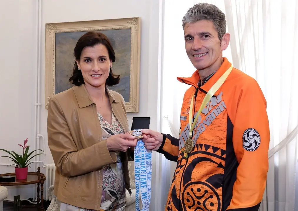 La alcaldesa de Santander, Gema Igual, ha felicitado al atleta Fernando Borrajo por las tres últimas medallas incorporadas a su palmarés y por toda una trayectoria de éxitos deportivos que ponen de manifiesto su versatilidad, puesto que ha competido en carreras de montaña, trail, campeonatos de raquetas de nieve o el maratón del Sáhara. Entre sus logros más recientes destacan las dos medallas conseguidas en el Campeonato del Mundo de Raquetas de Nieve disputado en febrero en de Saranac Lake (EEUU), donde fue plata en categoría mayores de 50 y bronce por equipos. Y además, acaba de revalidar también el título de campeón de España de Raquetas de Nieve veterano, prueba disputada el pasado fin de semana en Picos de Europa. Para Igual, la trayectoria de Borrajo resume algunos de los principales valores del deporte, como el trabajo y la constancia. La alcaldesa, que le ha recibido en el Ayuntamiento junto al concejal de Deportes, Juan Domínguez, ha felicitado a Borrajo por toda esa trayectoria y le ha deseado nuevos éxitos para seguir ampliando su ya largo palmarés de premios en pruebas de atletismo y montaña.