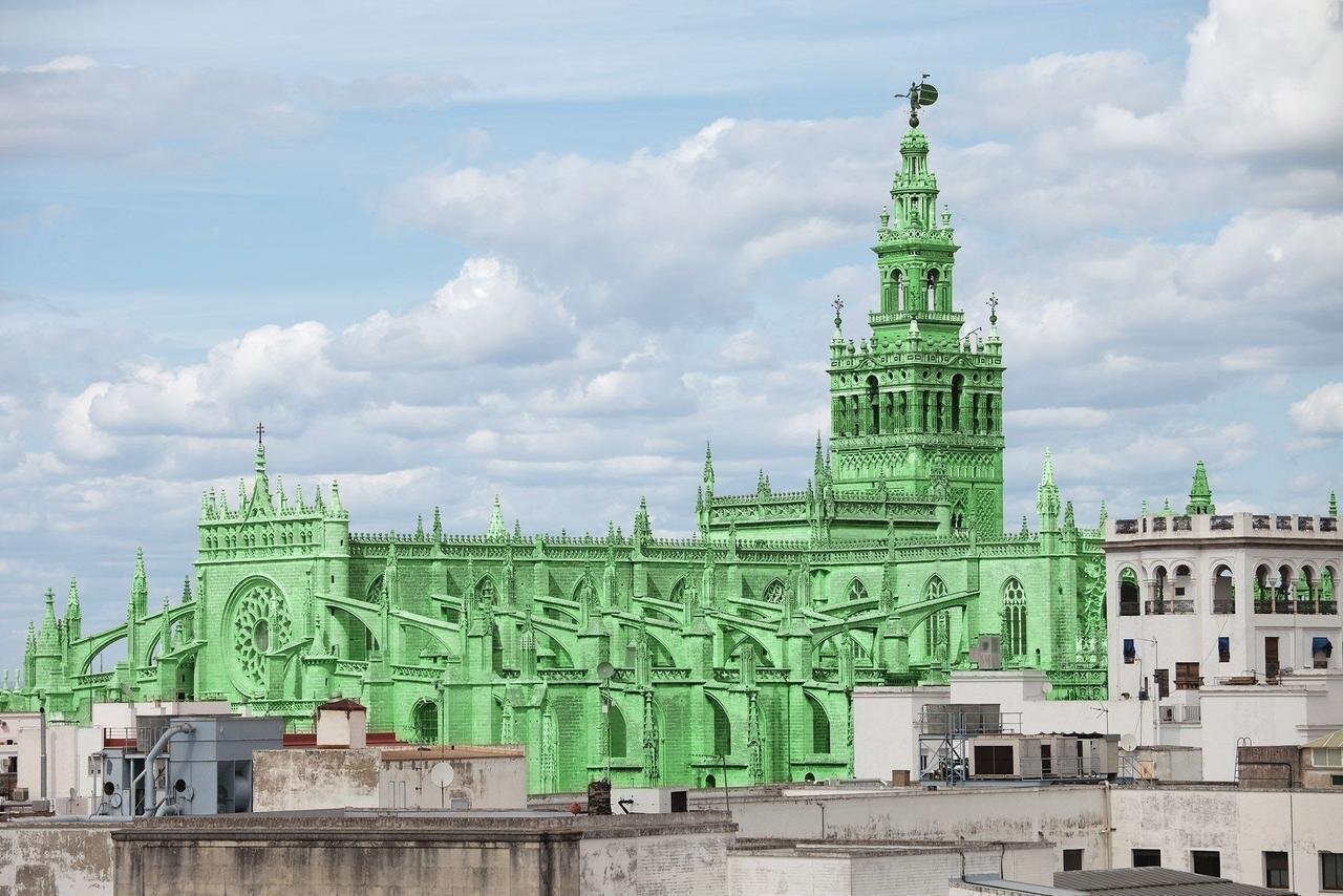 Así, se puede ver la catedral de Sevilla pintada de verde, la metropolitana de México pintada en malva o la de San Juan el Divino en Nueva York pintada de naranja. Otras de las catedrales elegidas son las de Milán, Viena, Colonia y París.