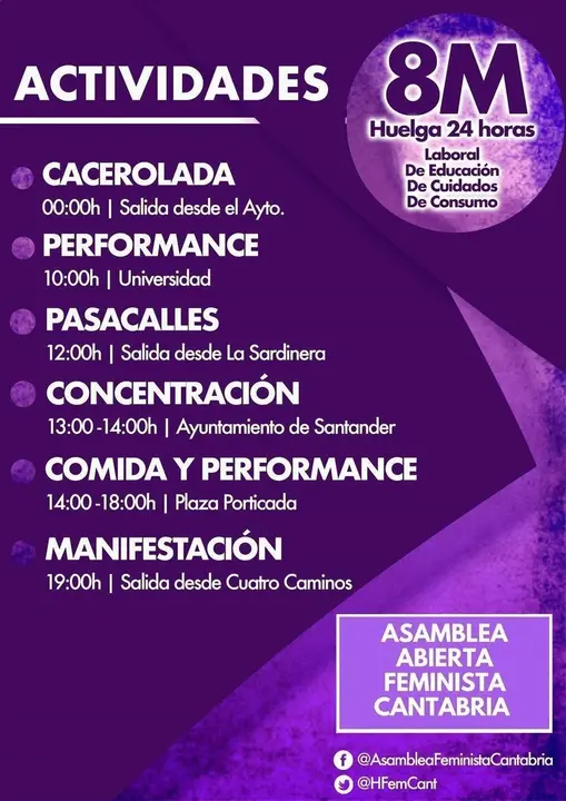 Las actividades arrancarán a las 00.00 horas del 8 de marzo con una cacerolada nocturna que saldrá del Ayuntamiento. Ya por la mañana, a partir de las 10.00 horas, las estudiantes y personal de la Universidad de Cantabria realizarán una performance en el edificio Interfacultativo y desde ahí bajarán al encuentro con el pasacalles que comenzará en la estatua de La Sardinera a las 12.00.