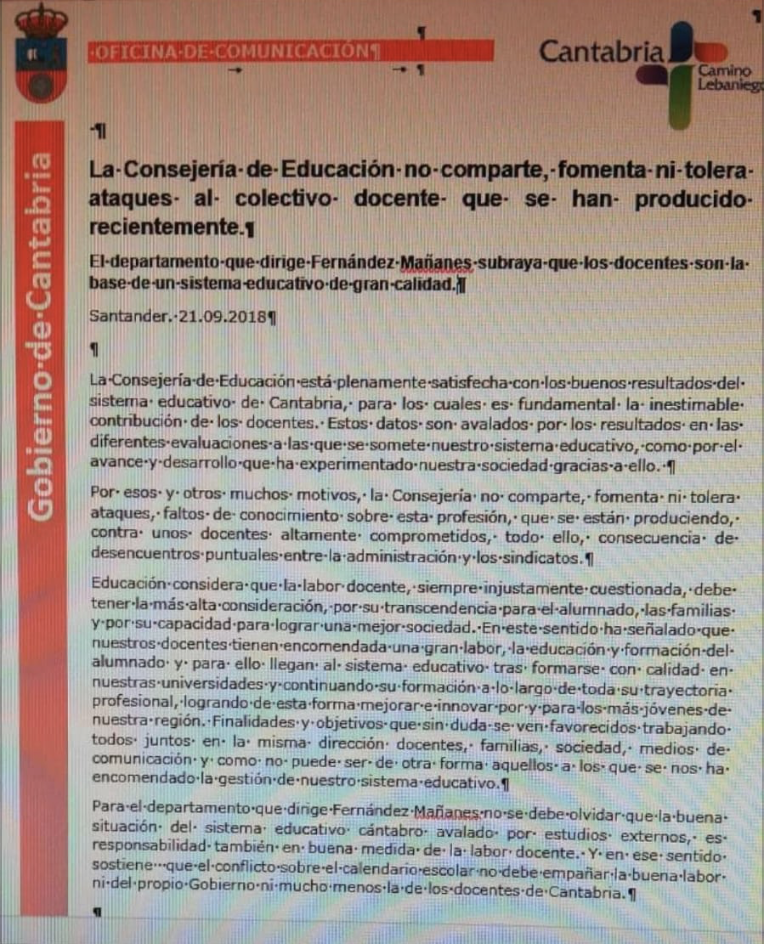 En la página de la Consejería de Educación (http://www.educantabria.es/), han publicado en la mañana de hoy la nota de prensa que lleva circulando desde el pasado jueves por whatsapp aclarando esto en la publicación: "(Nota de prensa remitida por el Gobierno de Cantabria el 21.09.2018 y no publicada por ningún medio de comunicación)."