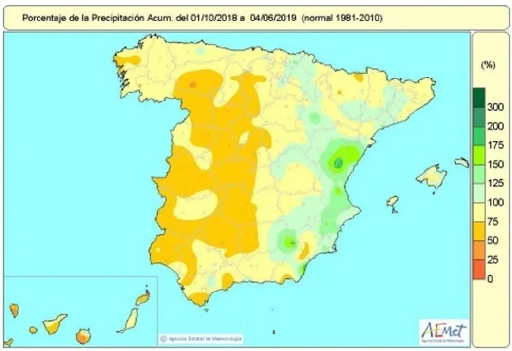 La falta de lluvias acumulada desde que comenzó el año hidrológico el pasado mes de octubre sigue creciendo y se sitúa el 4 de junio en un 15 por ciento por debajo de lo normal, ya que ha llovido 450 litros por metro cuadrado de media en el conjunto de España, 80 litros por metro cuadrado menos de los 530 litros por metro cuadrado que serían lo normal.
